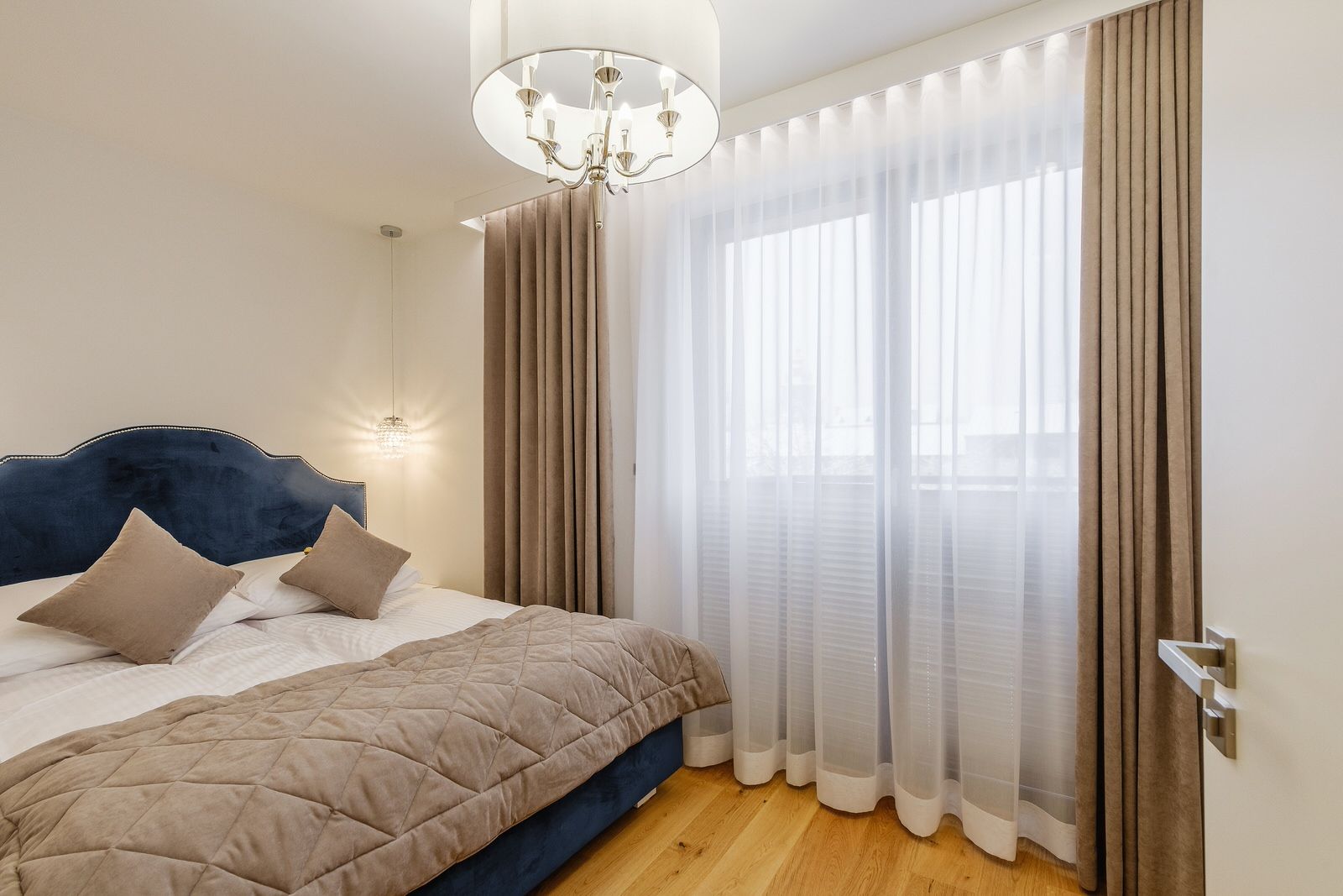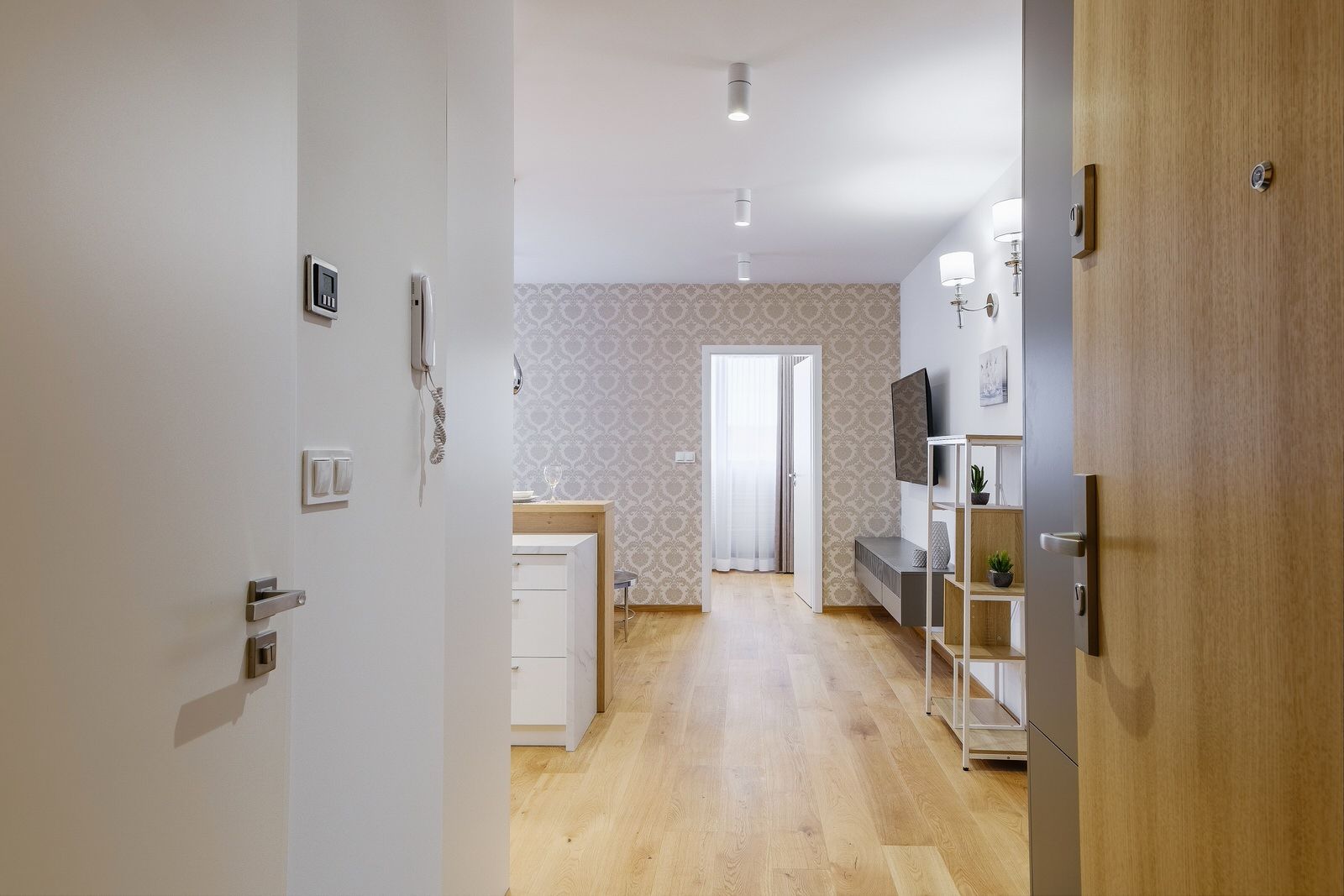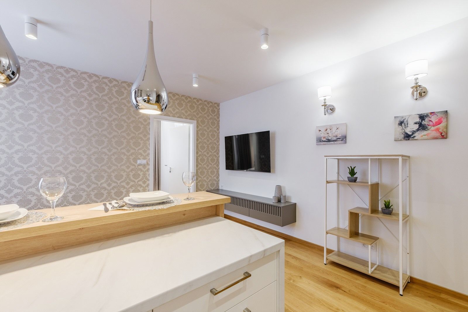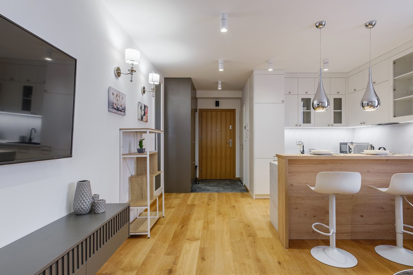 Apartament składa się z oddzielnej sypialni z łóżkiem małżeńskim, dużej szafy oraz szafek nocnych. W salonie znajduje się dodatkowo rozkładana sofa na dwie osoby. Obiekt wyposażony jest w obszerną łazienkę, w skład której wchodzi kabina prysznicowa oraz pralka. Apartament posiada także w pełni wyposażony aneks kuchenny oraz wyspę. Wyjście na balkon prowadzi z sypialni.