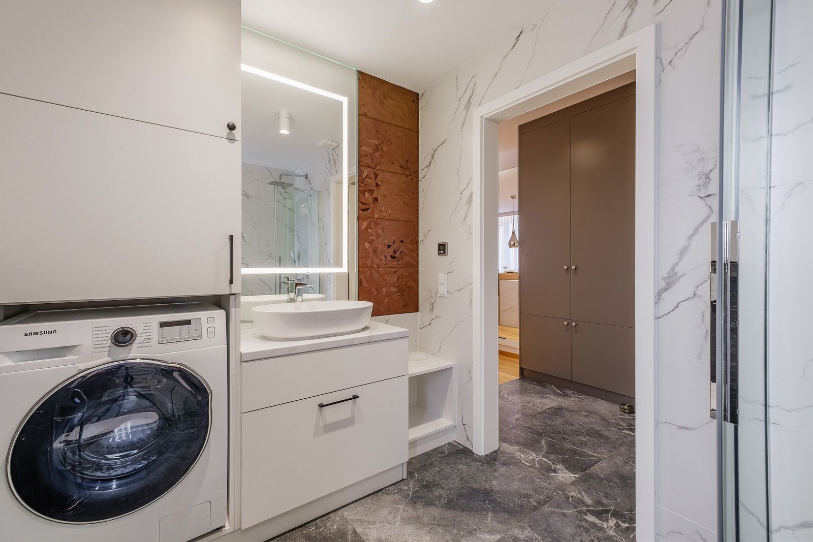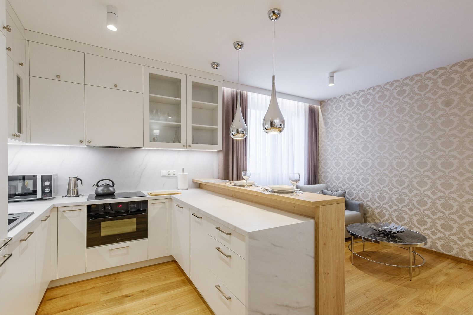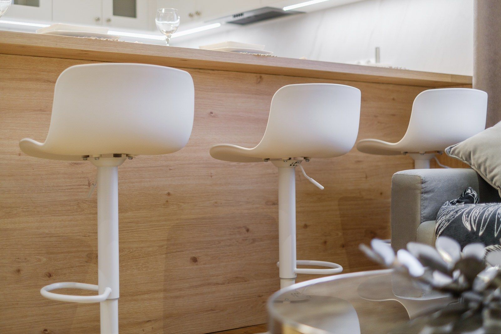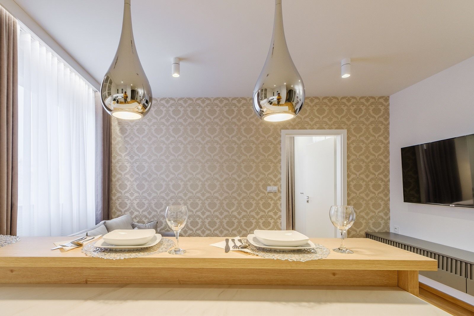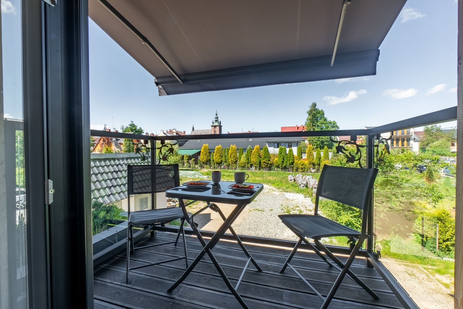 Apartament składa się z oddzielnej sypialni z łóżkiem małżeńskim, dużej szafy oraz szafek nocnych. W salonie znajduje się dodatkowo rozkładana sofa na dwie osoby. Obiekt wyposażony jest w obszerną łazienkę, w skład której wchodzi kabina prysznicowa oraz pralka. Apartament posiada także w pełni wyposażony aneks kuchenny oraz wyspę. Wyjście na balkon prowadzi z sypialni.