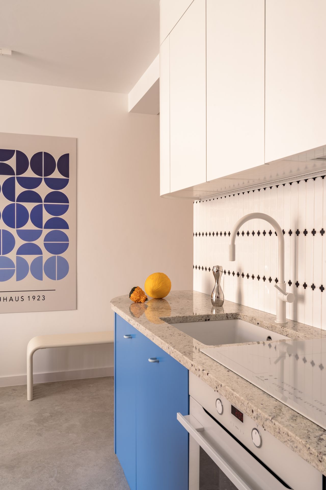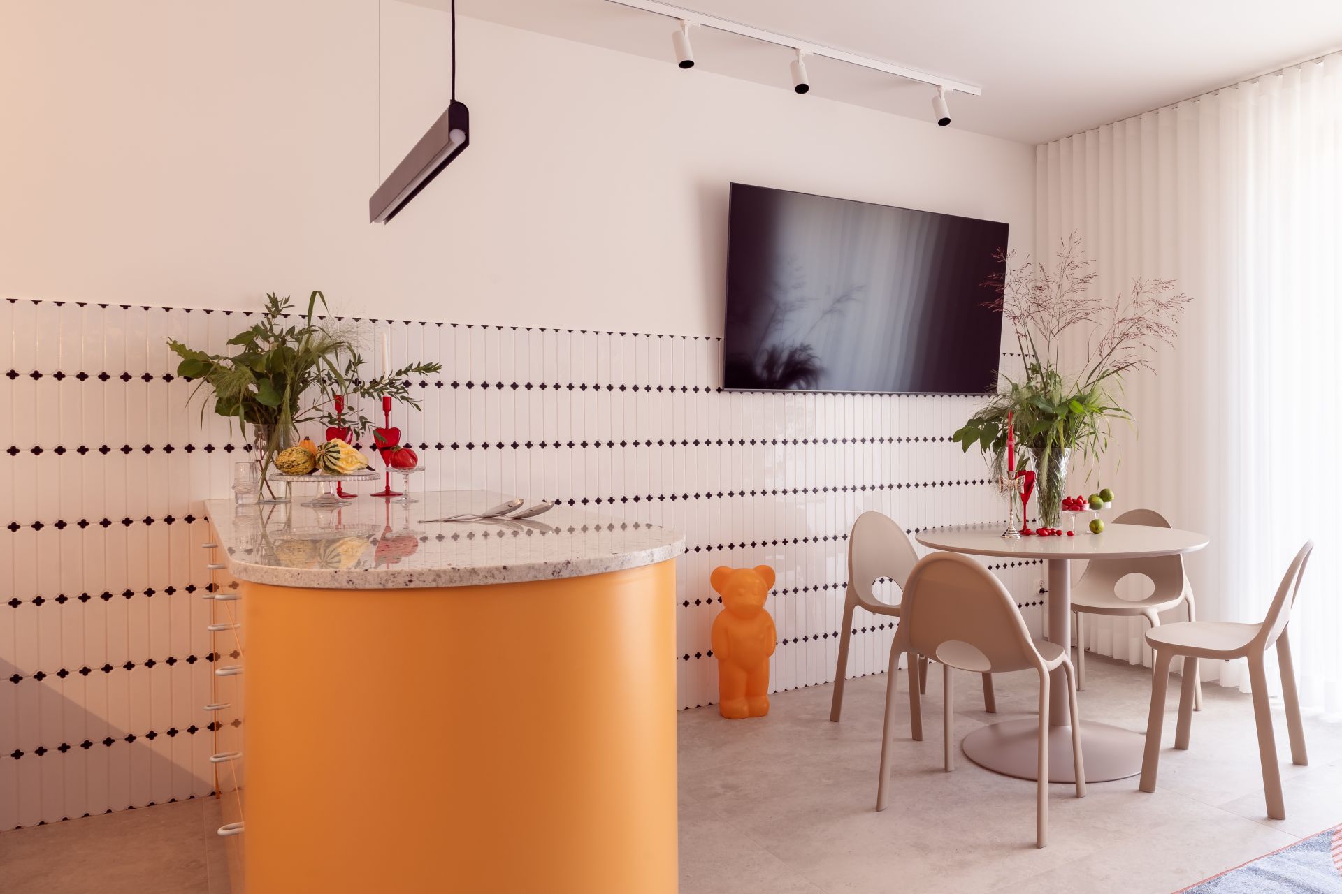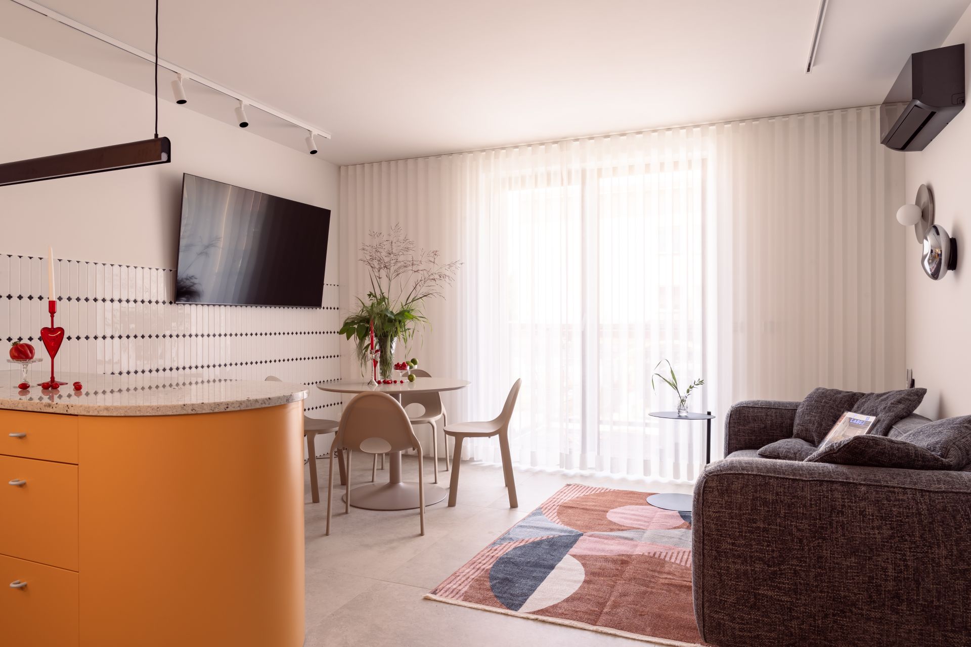 W części dziennej do dyspozycji Gości znajduje się wygodna sofa, stół jadalniany oraz aneks kuchenny z wyspą i pełnym wyposażeniem – zmywarką, płytą indukcyjną, piekarnikiem oraz lodówką. Apartament jest klimatyzowany, co zapewnia komfort o każdej porze roku.