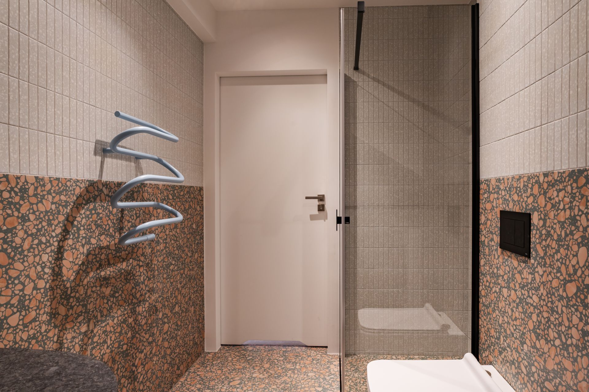 Łazienka wyposażona została w kabinę prysznicową, umywalkę, pralkę oraz suszarkę do włosów.