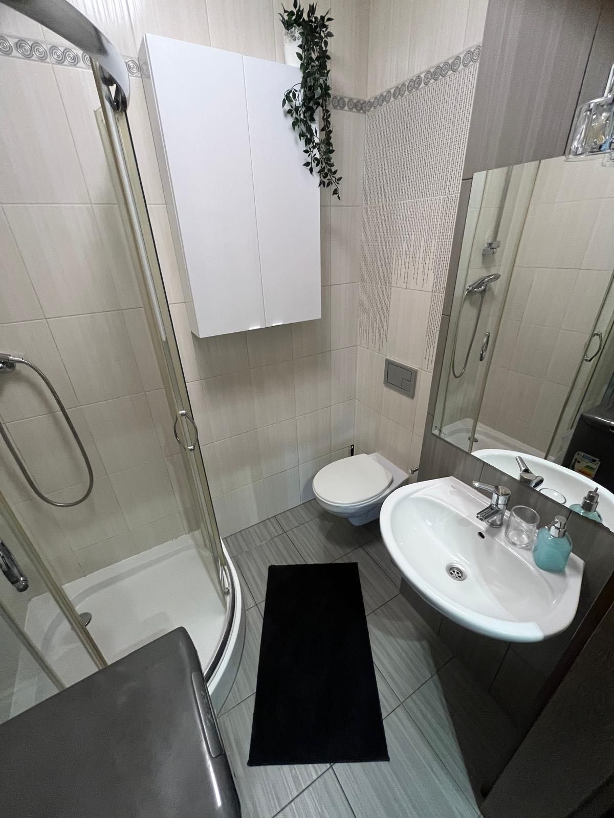 Apartament wyposażony jest w łazienkę, w skład której wchodzi kabina prysznicowa, umywalka i pralka. Apartament ma w pełni wyposażony aneks kuchenny.