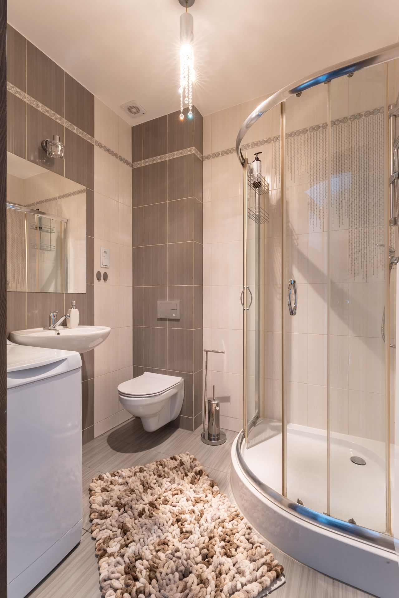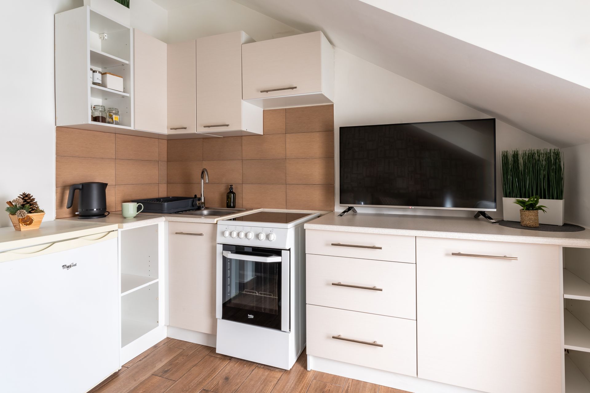 Apartament wyposażony jest w łazienkę, w skład której wchodzi kabina prysznicowa, umywalka i pralka. Apartament ma w pełni wyposażony aneks kuchenny.