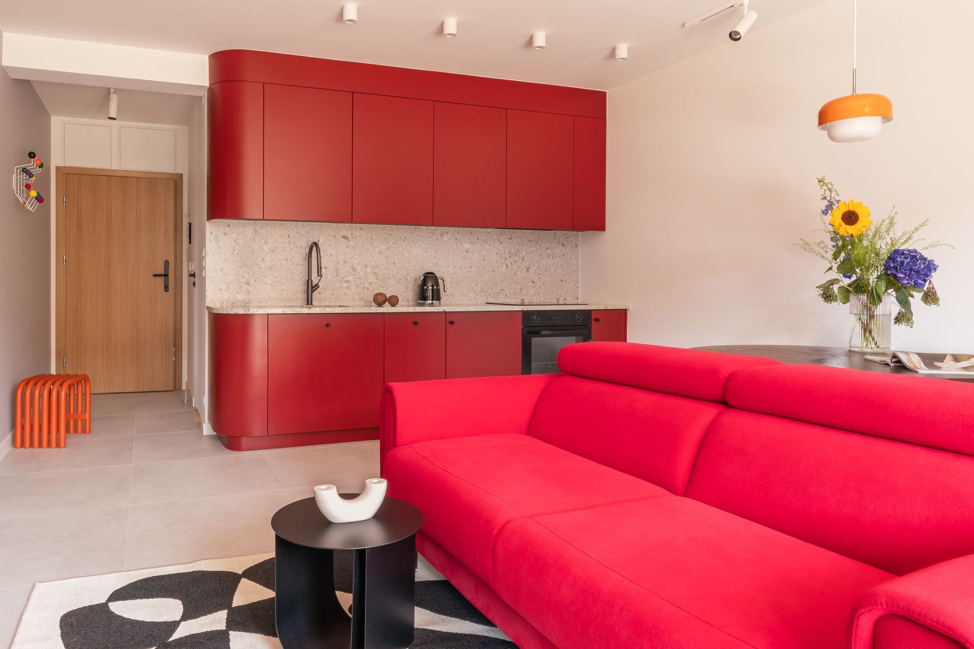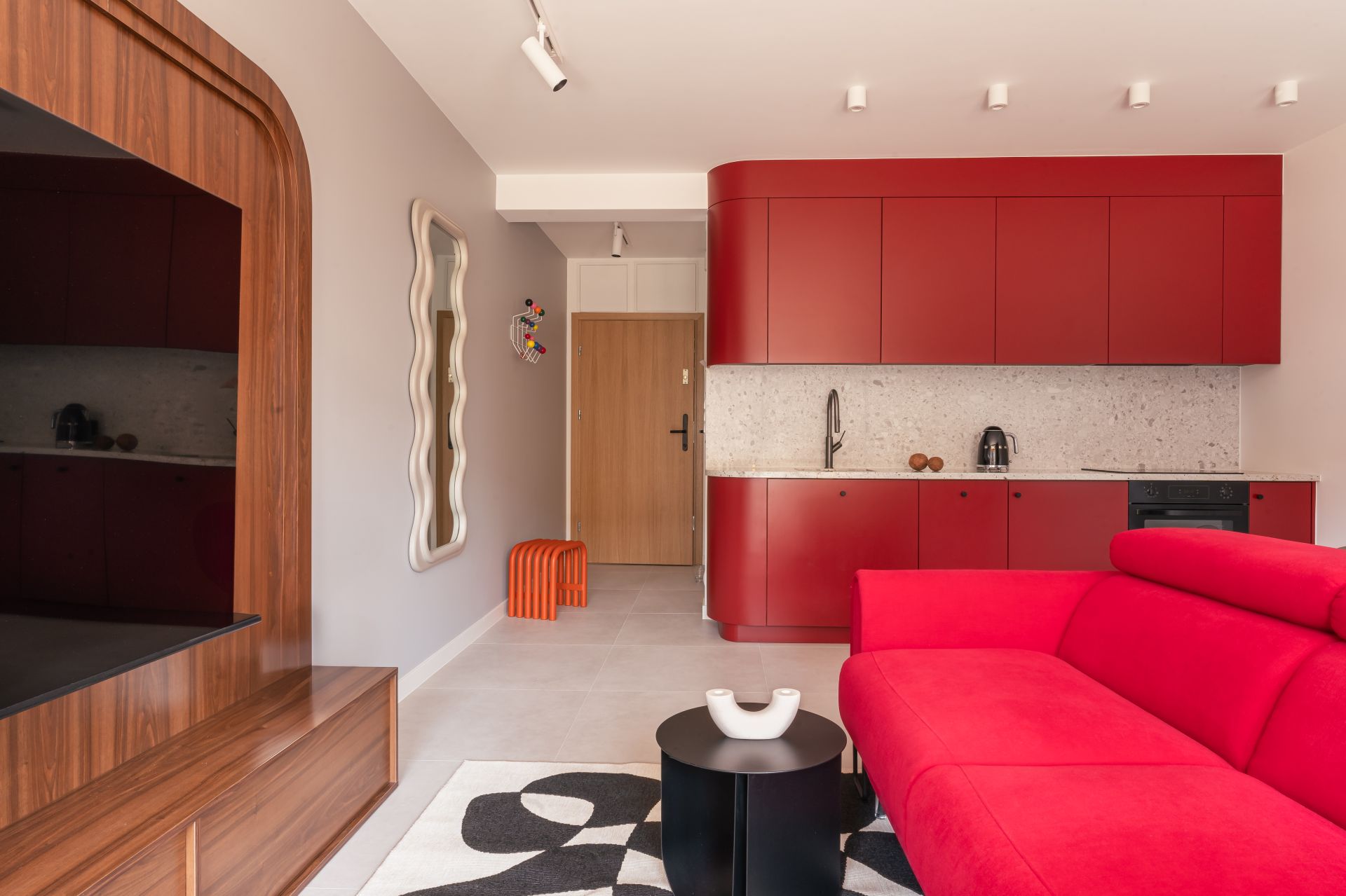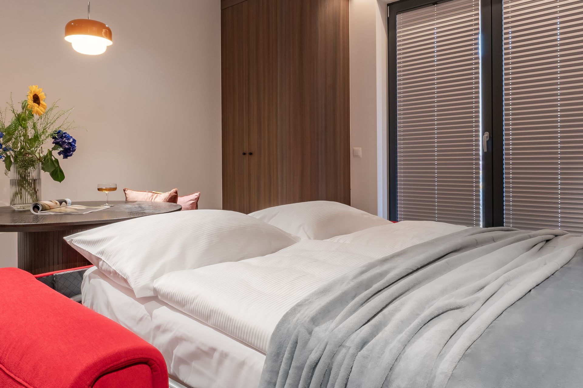 Apartament składa się z pokoju głównego, w którym znajduje się sofa z funkcją spania oraz szafa. Łazienka wyposażona jest w kabinę prysznicową oraz pralkę. Apartament posiada w pełni wyposażony aneks kuchenny oraz balkon, na którym znajdują się meble ogrodowe. Apartament posiada widok na ulicę.