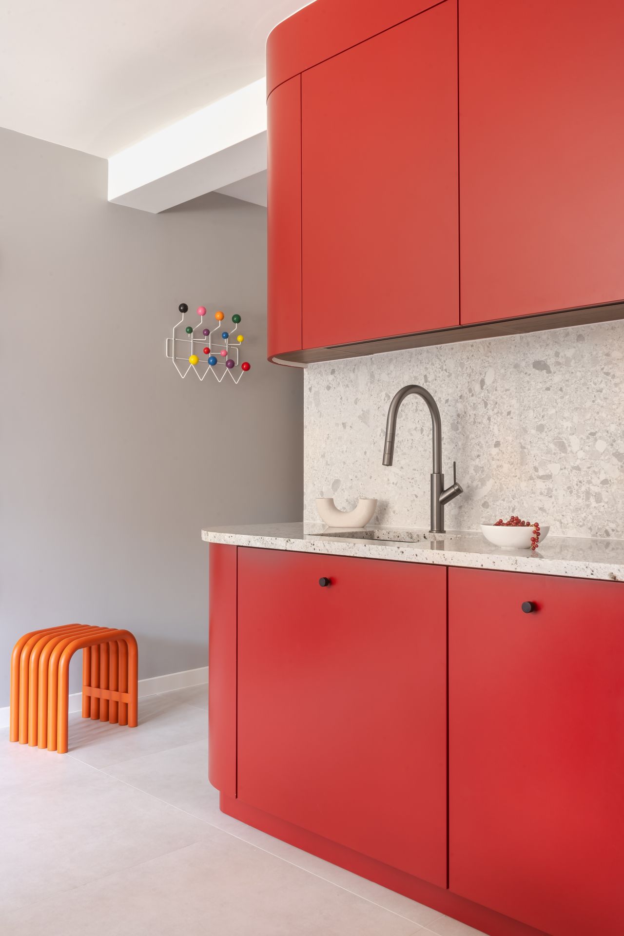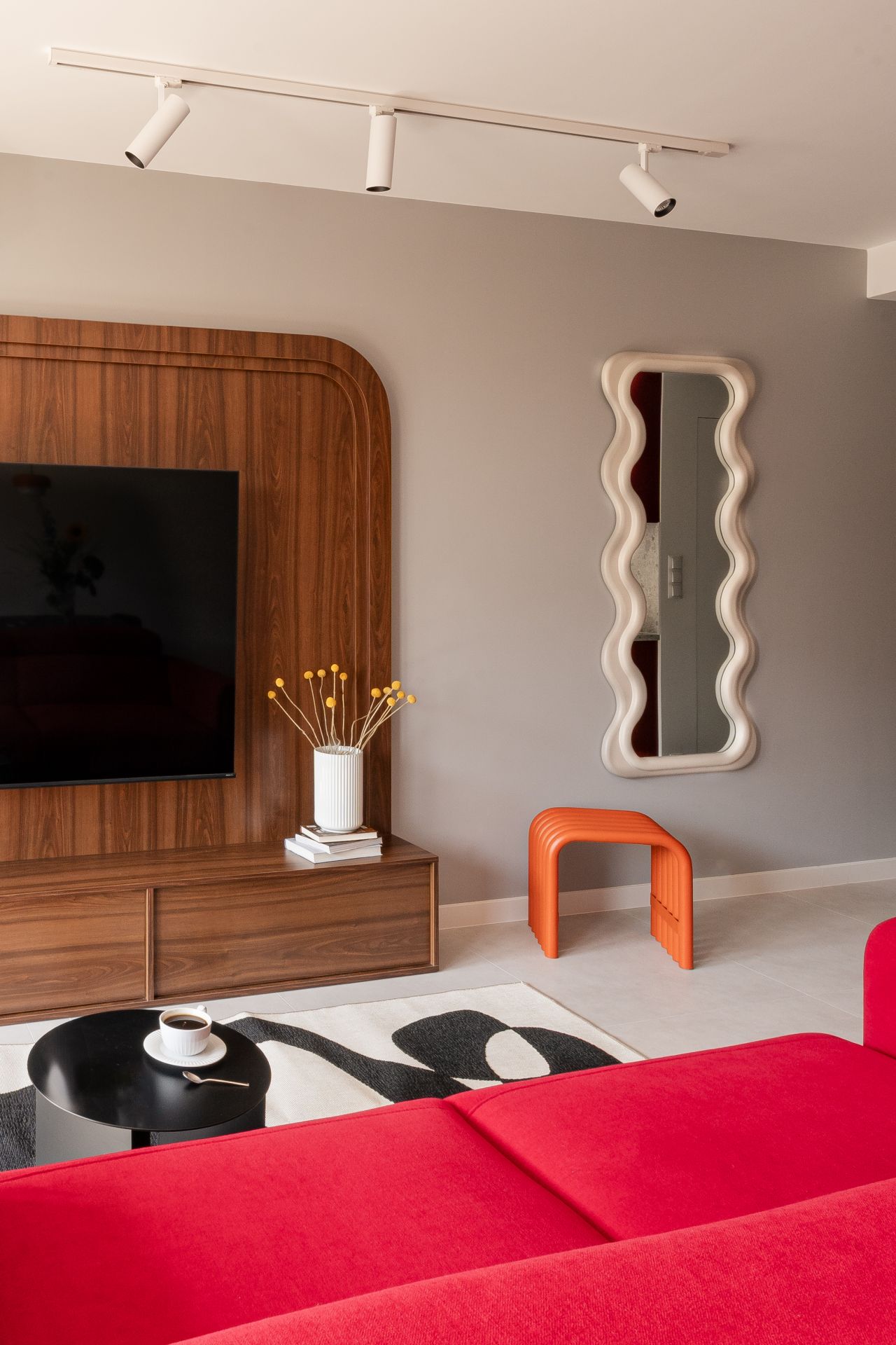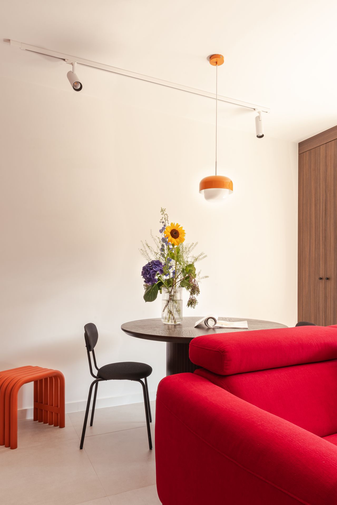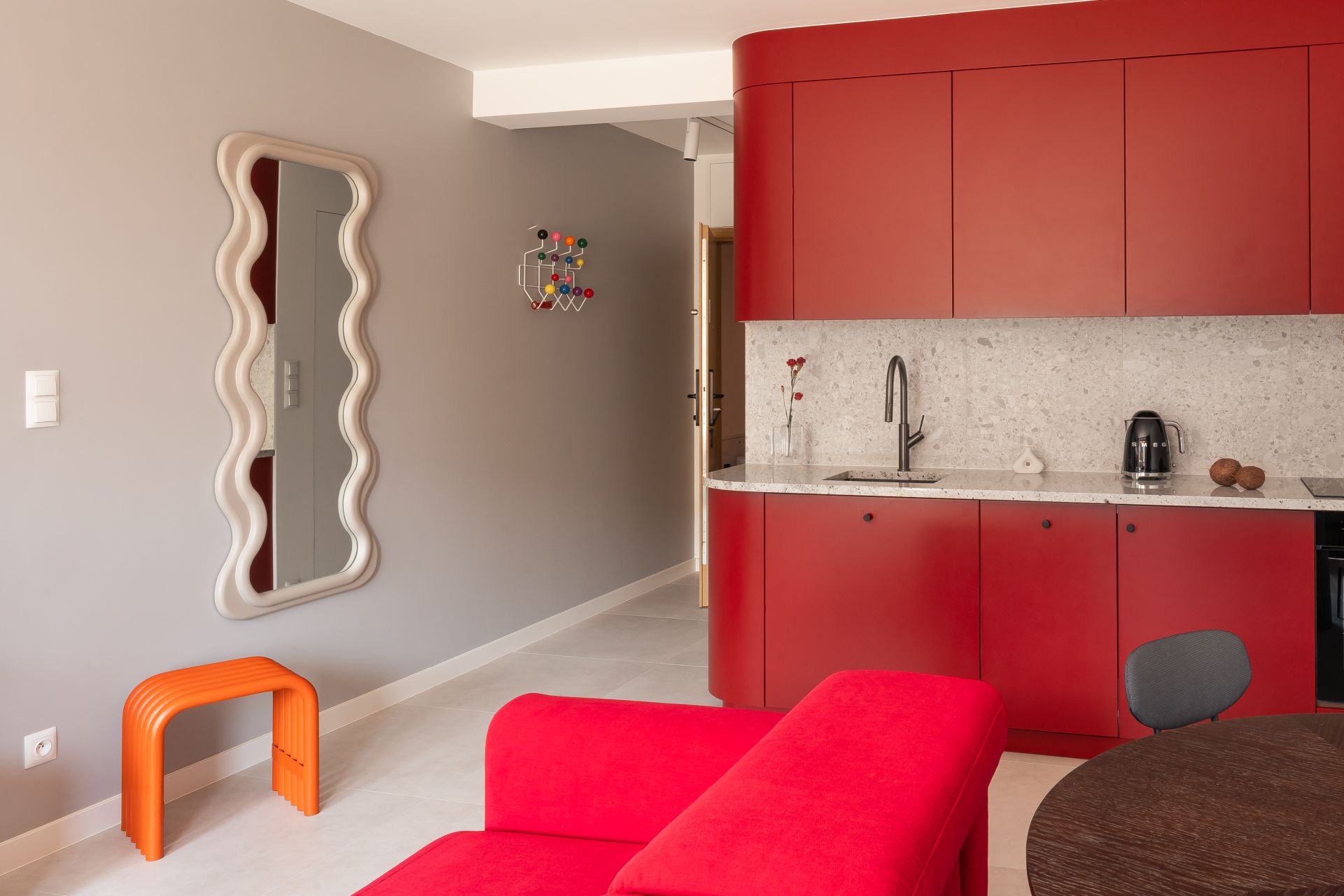 Apartament składa się z pokoju głównego, w którym znajduje się sofa z funkcją spania oraz szafa. Łazienka wyposażona jest w kabinę prysznicową oraz pralkę. Apartament posiada w pełni wyposażony aneks kuchenny oraz balkon, na którym znajdują się meble ogrodowe. Apartament posiada widok na ulicę.