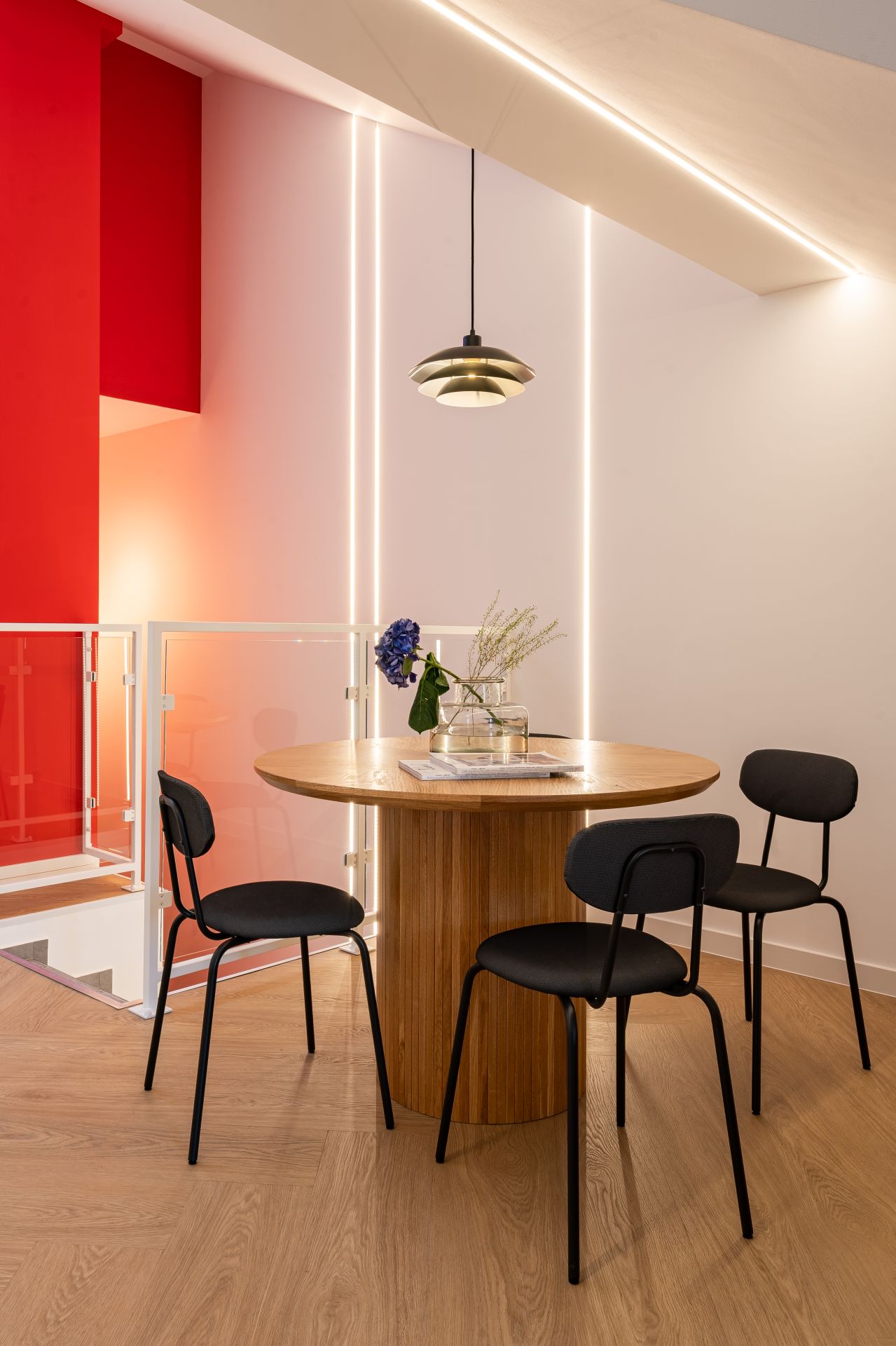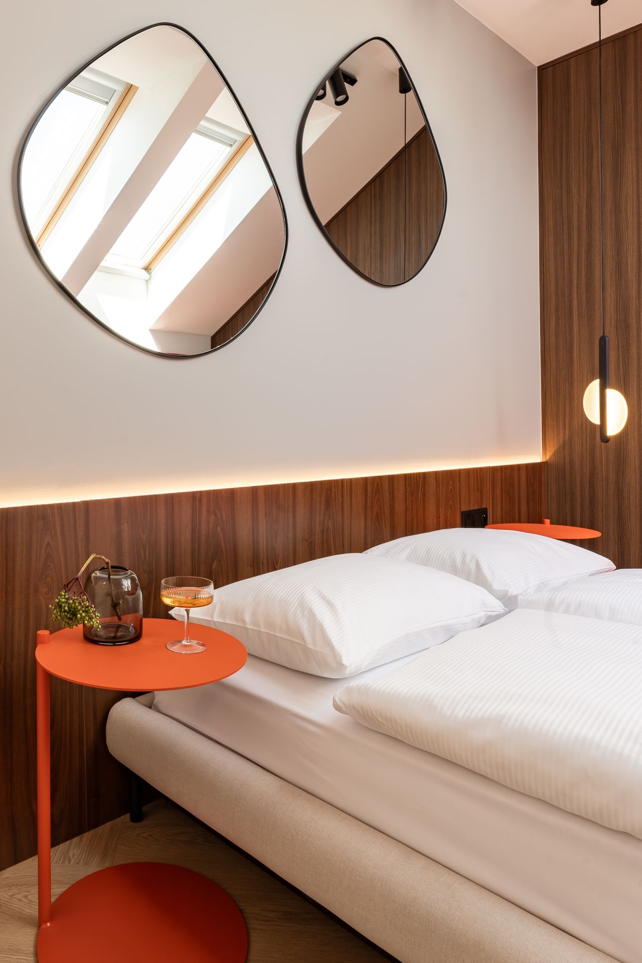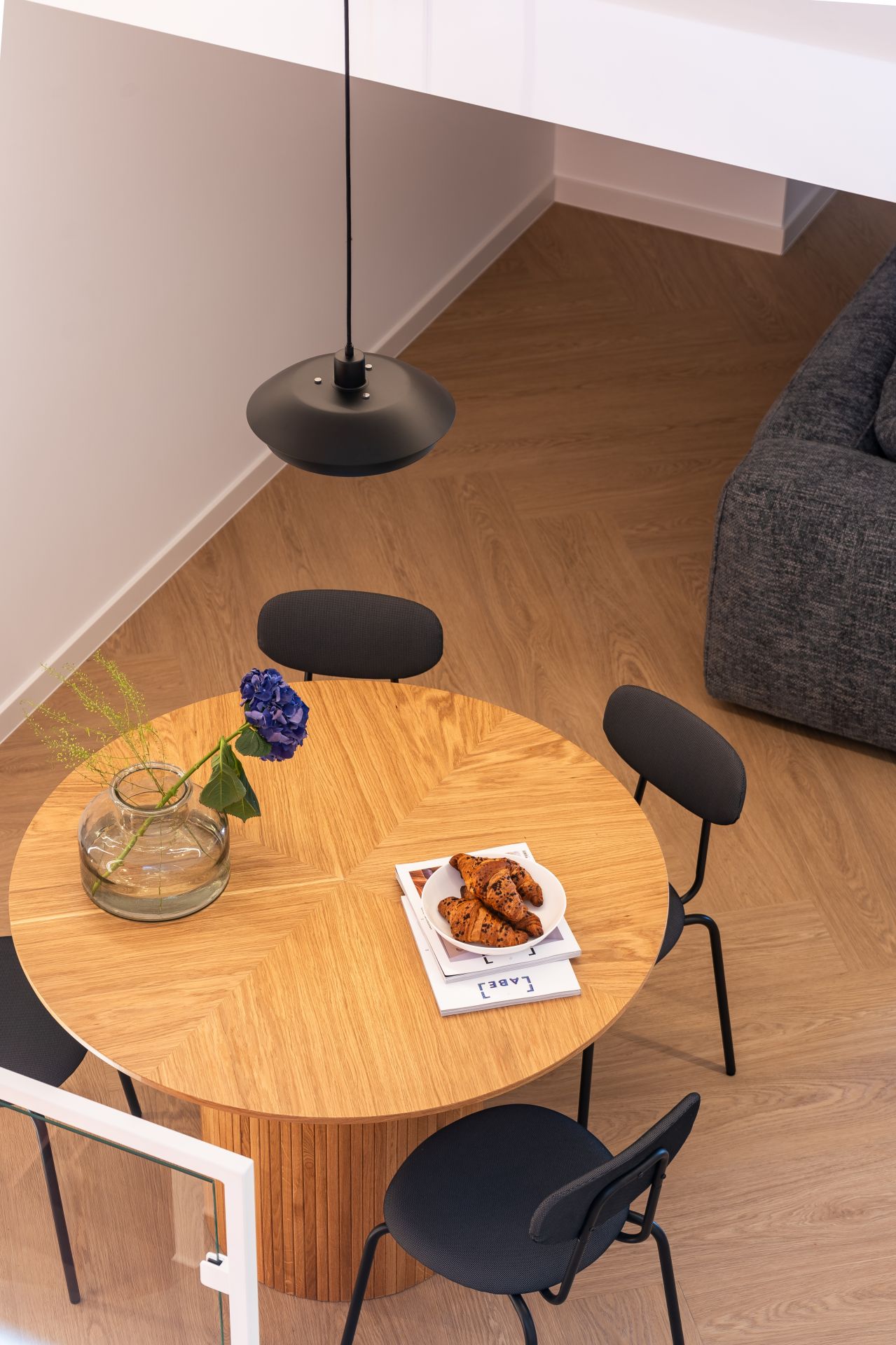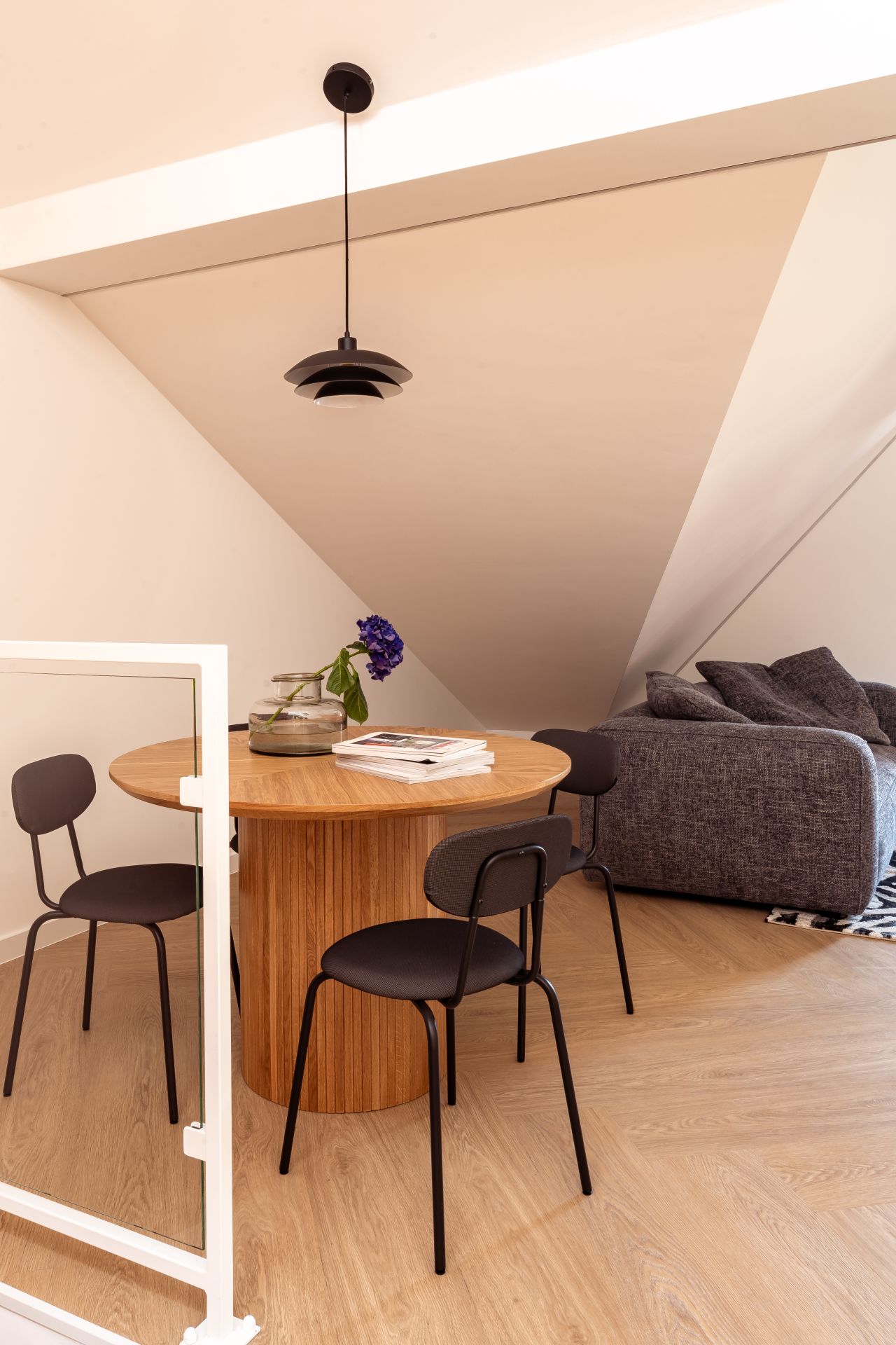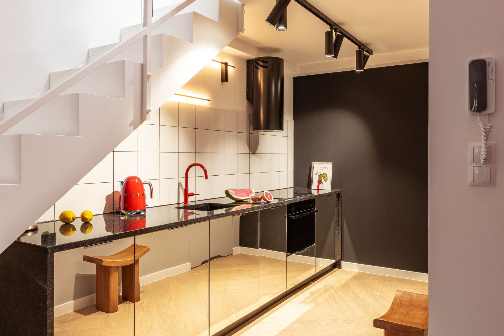 Apartament składa się z antresoli, na której znajduje się łóżko typu king-size, stoliki nocne oraz szafa. W salonie znajduje się dodatkowo rozkładana sofa. Łazienka wyposażona jest w kabinę prysznicową oraz pralkę. Apartament posiada w pełni wyposażony aneks kuchenny oraz balkon, na którym znajdują się meble ogrodowe. Apartament posiada widok na ulicę.