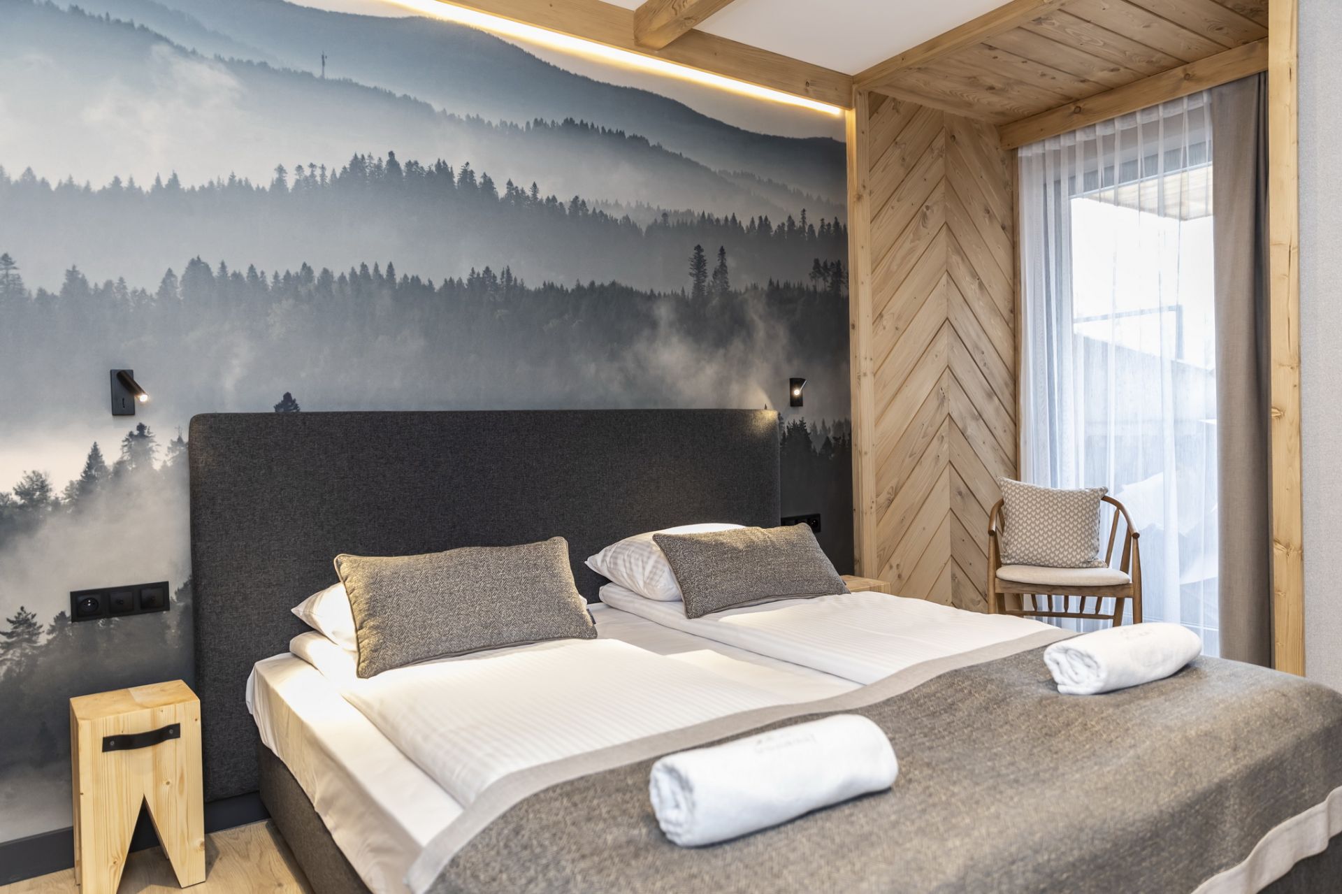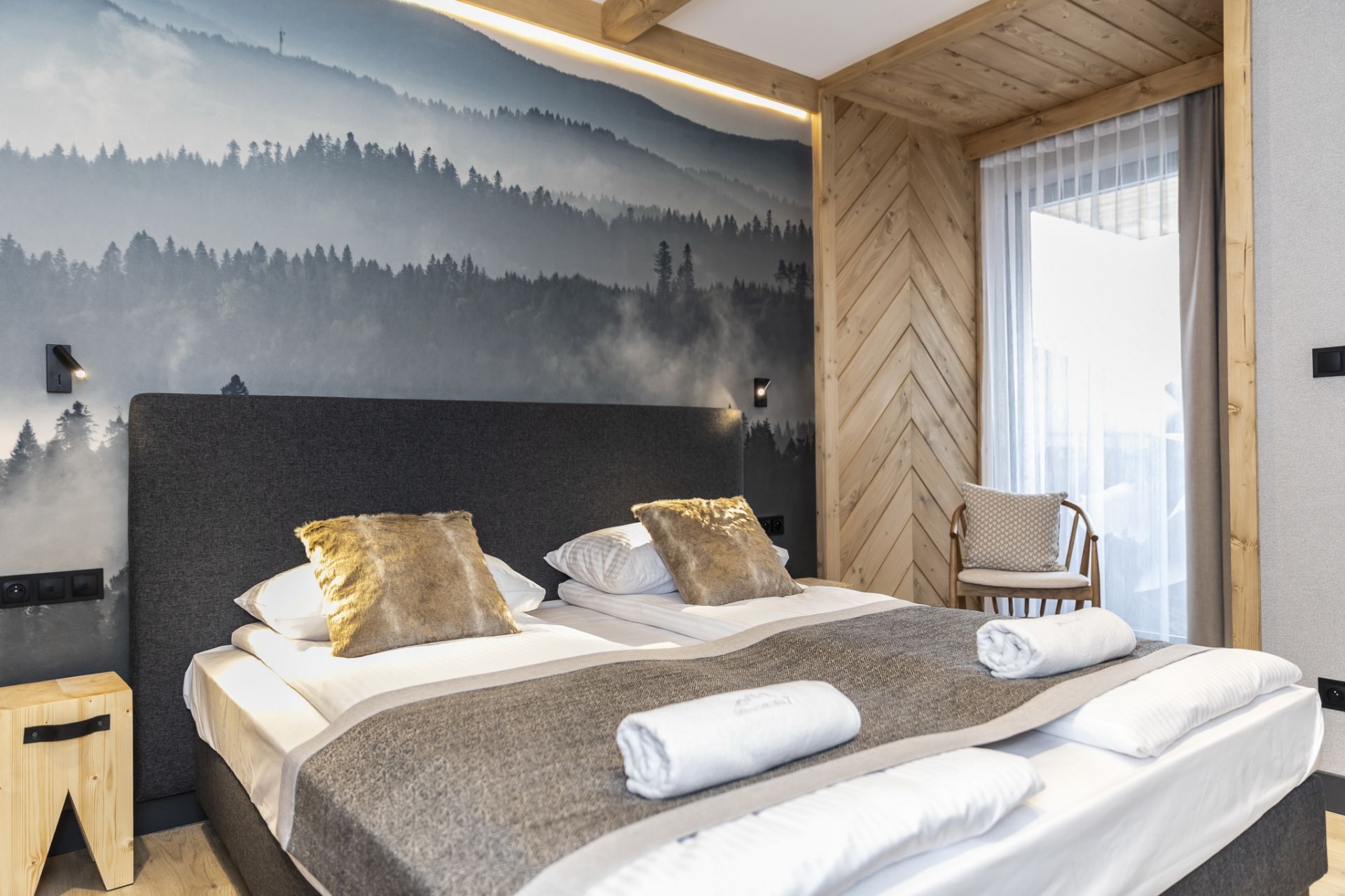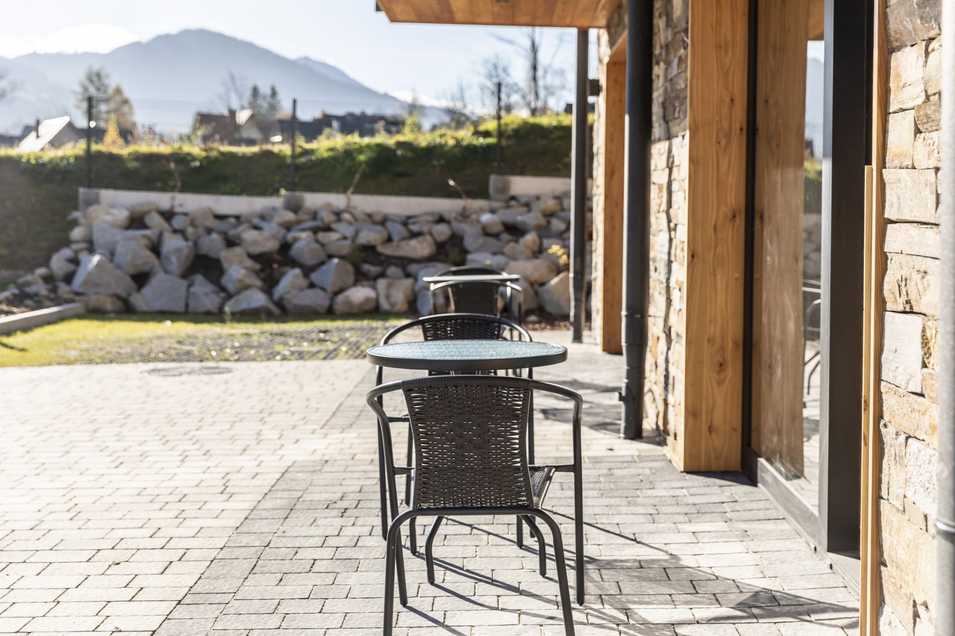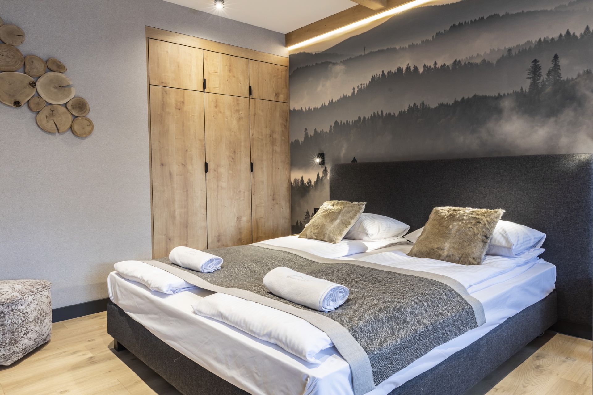 Apartament składa się z salonu połączonego z aneksem kuchennym oraz sypialni i łazienki, a z południowego tarasu można podziwiać Giewont oraz Czerwone Wierchy.