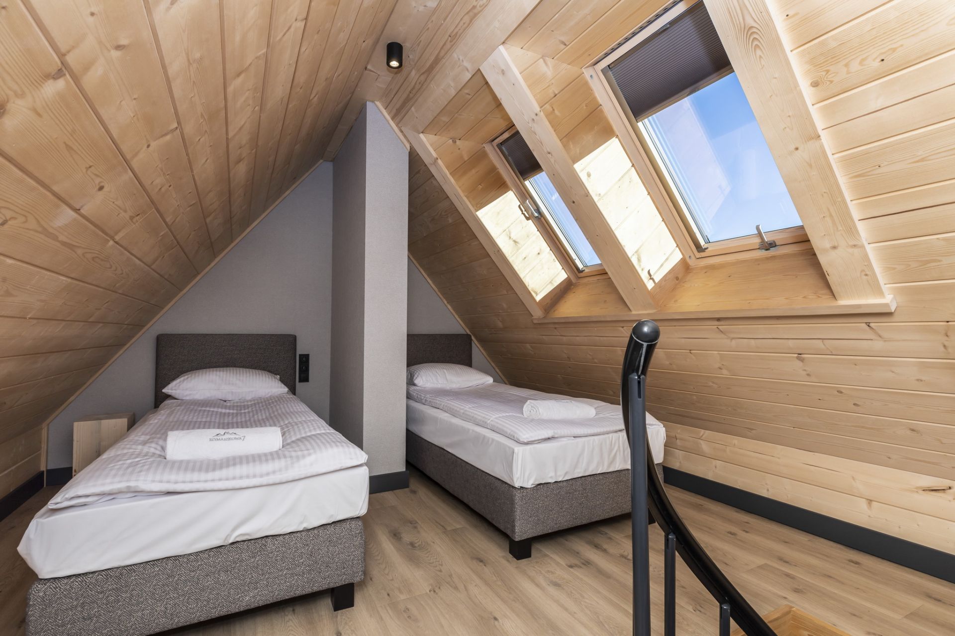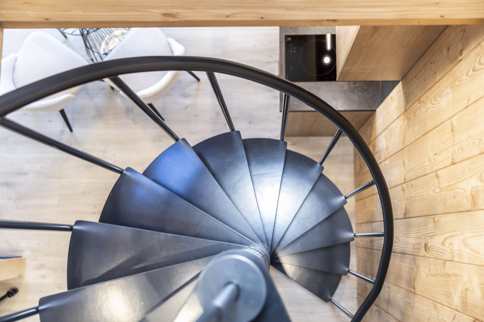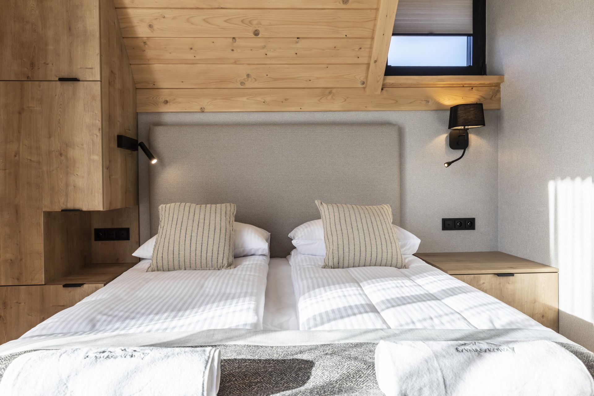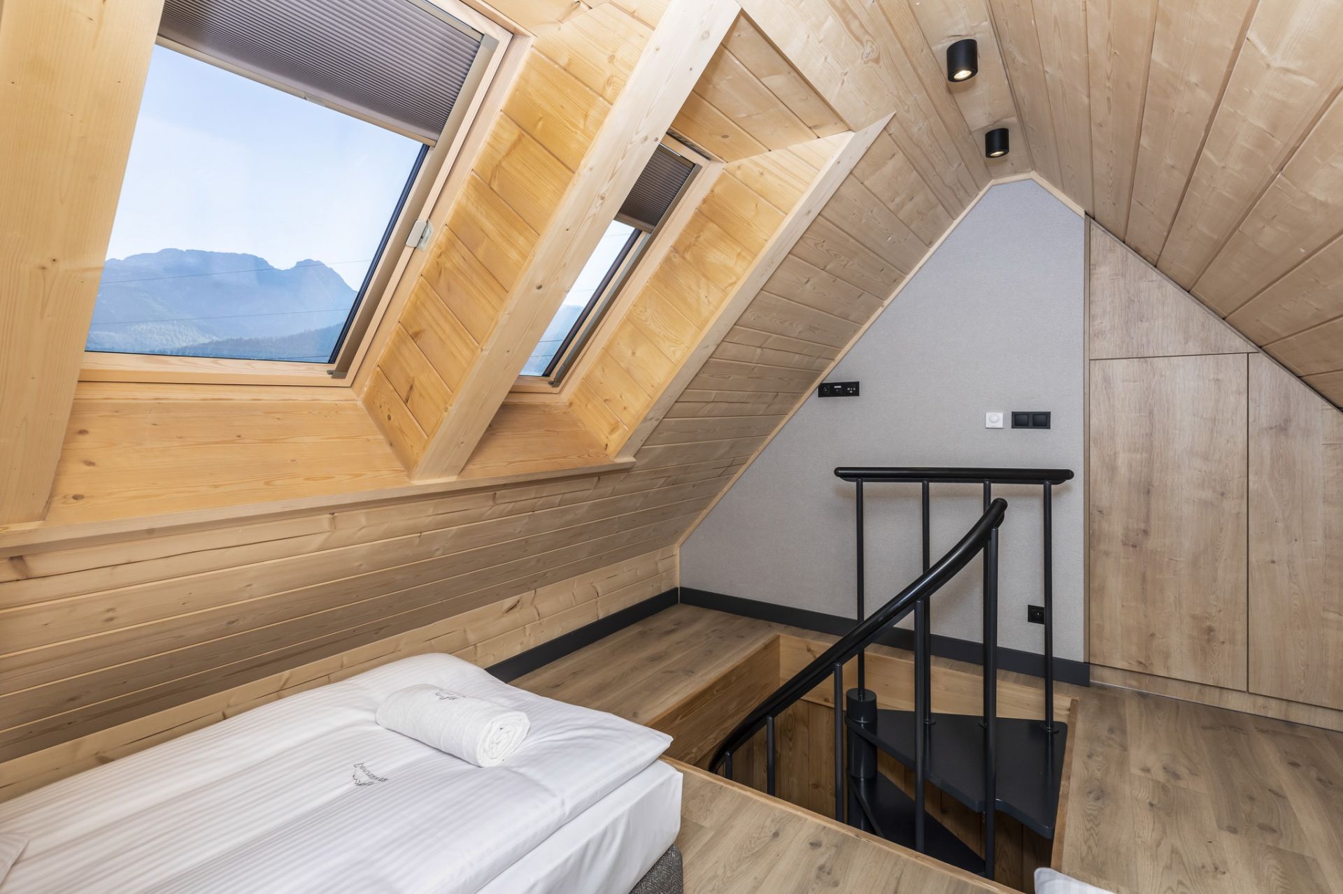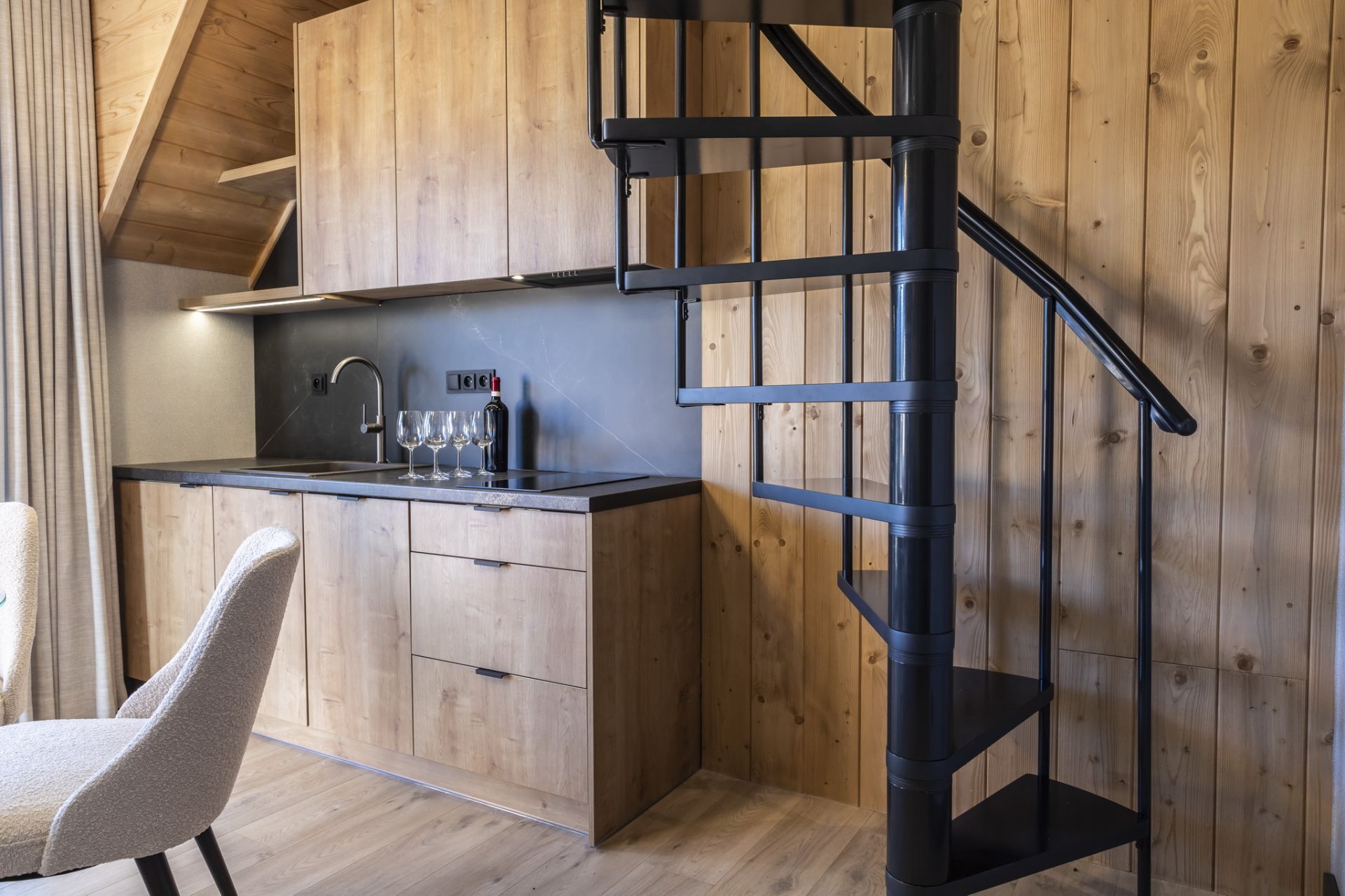 Funkcjonalne wnętrze składa się z antresoli, sypialni, łazienki wyposażonej w prysznic oraz przeszklonej ściany widokowej znajdującej się w salonie, który połączony jest z aneksem kuchennym.