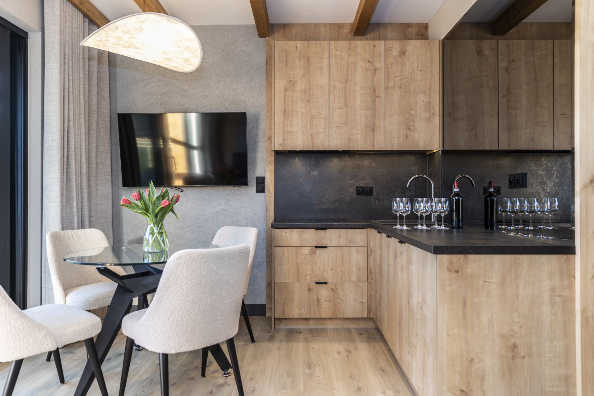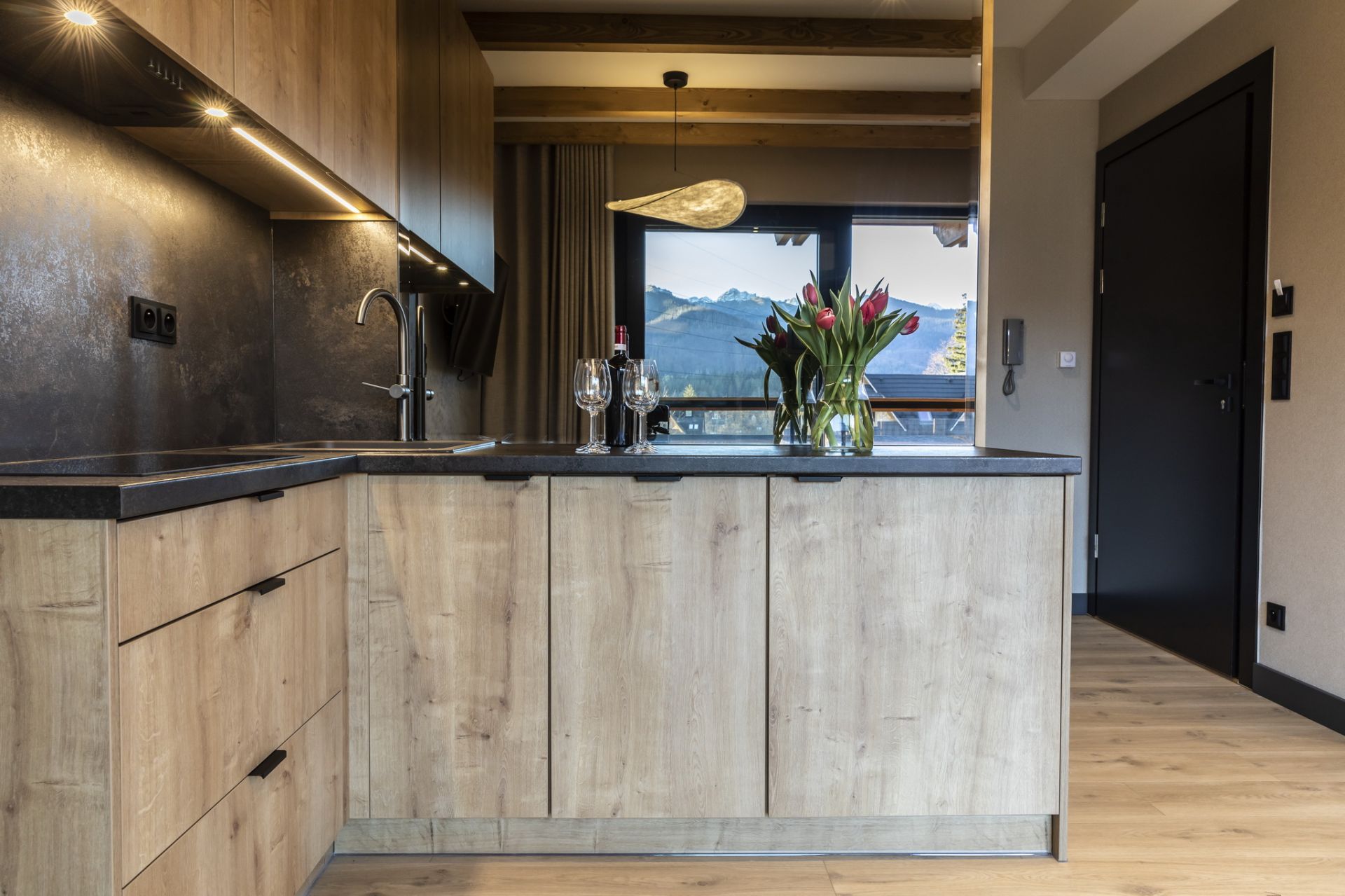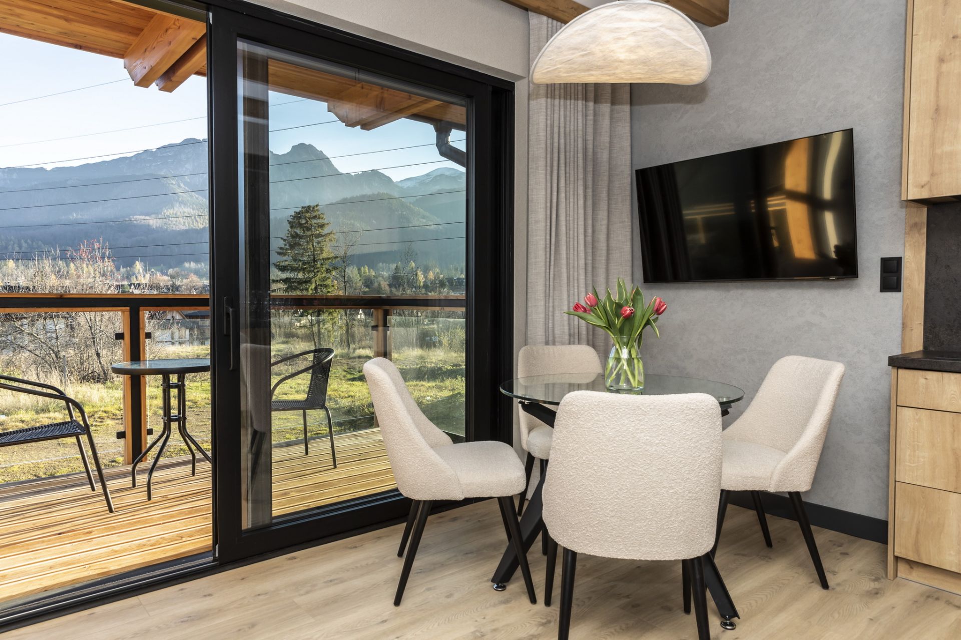 Składa się z salonu, połączonego z w pełni wyposażonym aneksem kuchennym oraz sypialni. Przestronna łazienka wyposażona jest w prysznic. Z południowego tarasu można podziwiać widok na Giewont oraz pełną panoramę Tatr.