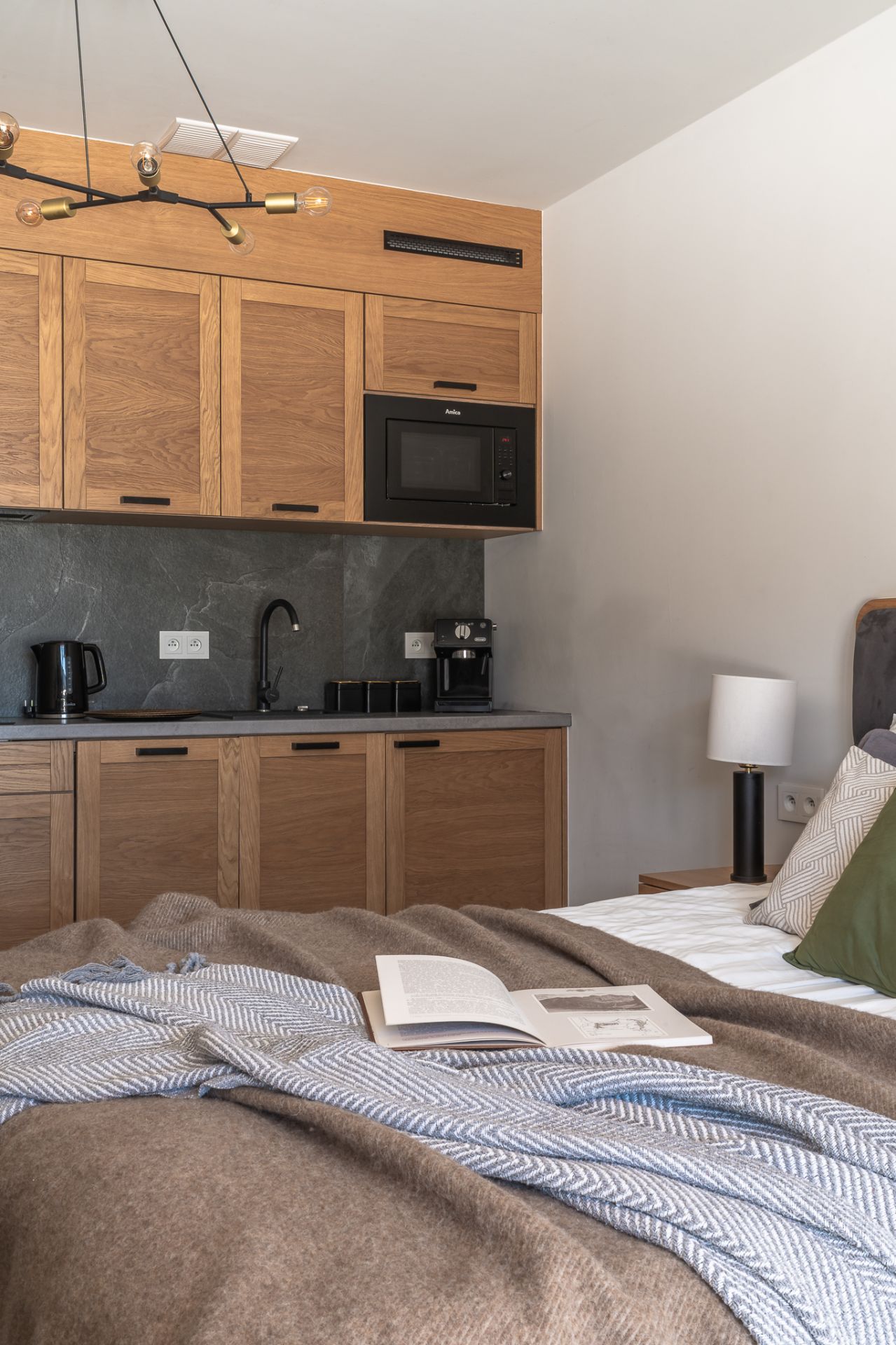 – część dzienną z aneksem kuchennym (zmywarka, ekspres do kawy, czajnik, lodówka, standardowe wyposażenie)