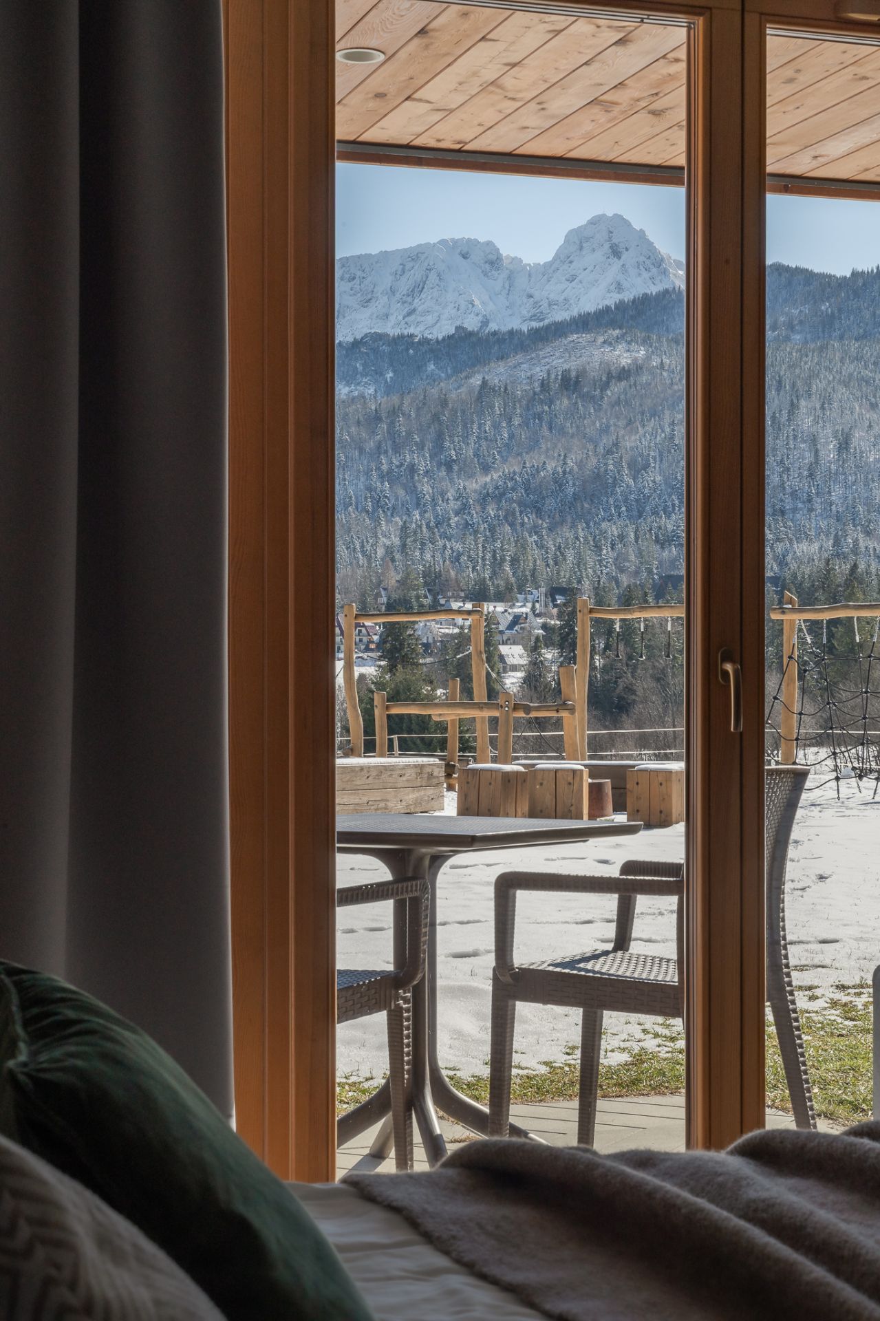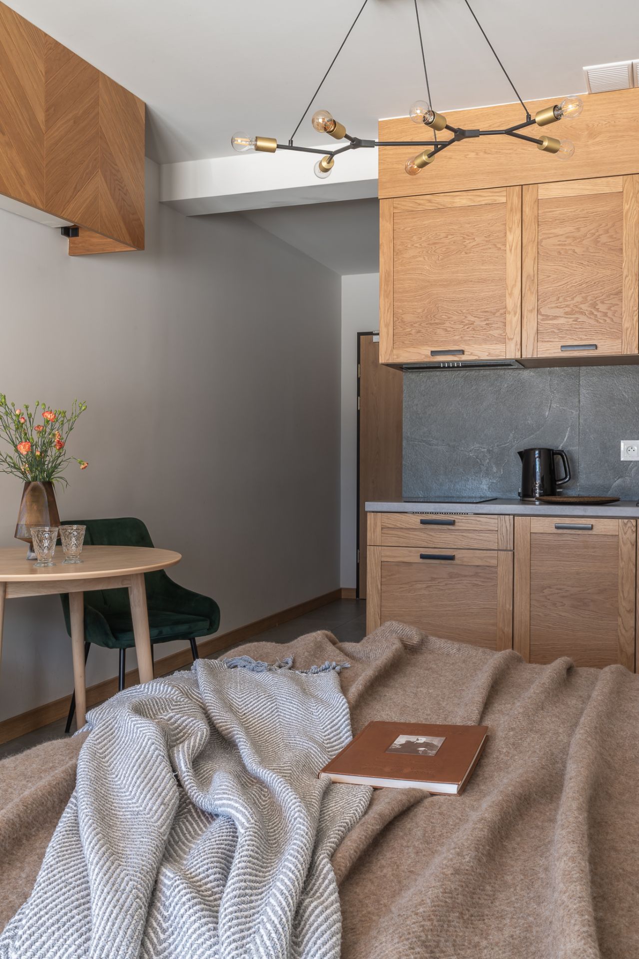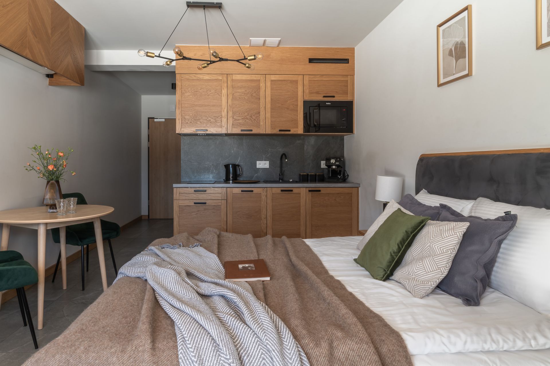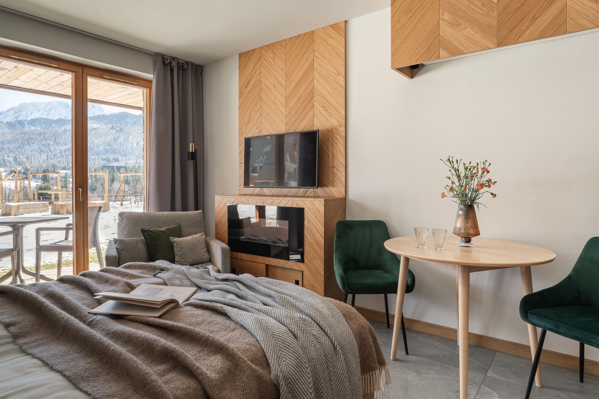Apartament znajduje się w jednej z nowo wybudowanych willi. Wnętrze zostało zaprojektowane tak, aby oddać górski charakter miejsca i jednocześnie zapewnić nowoczesną funkcjonalność — naturalne materiały, góralska jodełka oraz starannie dobrane meble tworzą spójną i przytulną całość.
