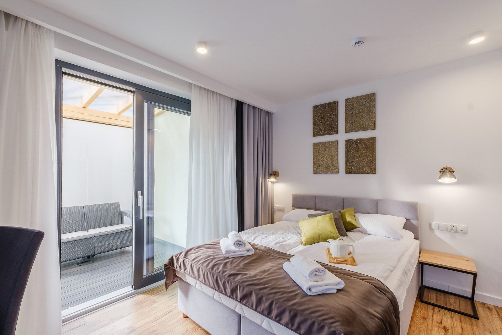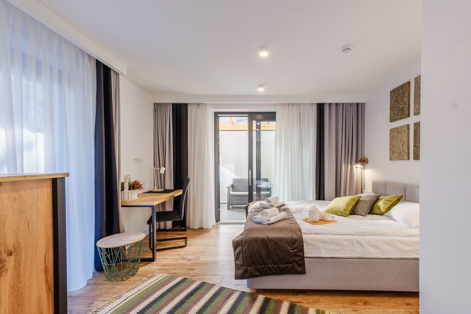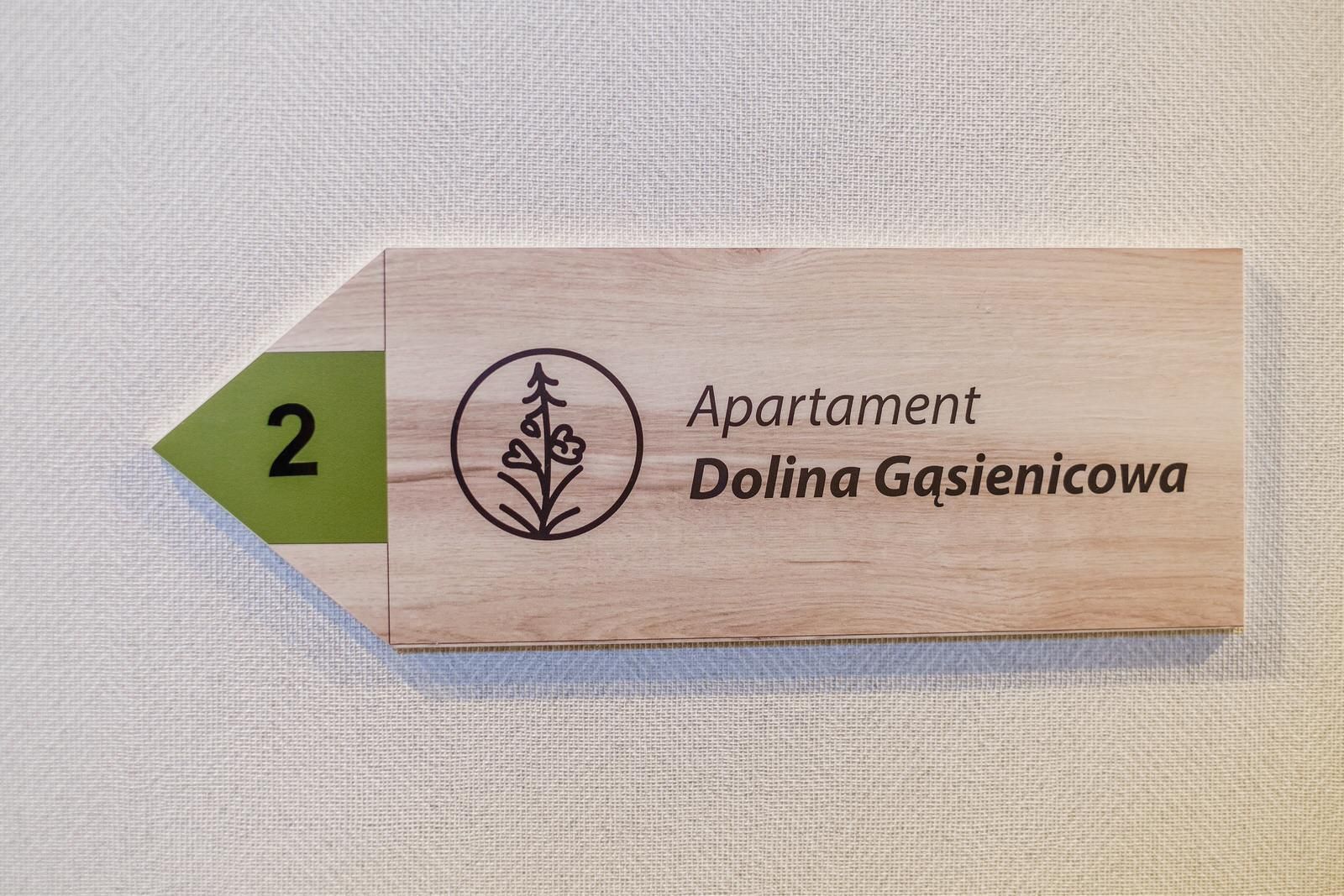 Apartament urządzony i utrzymany jest w ciepłych barwach z dodatkiem zielonych akcentów typowych dla Doliny Gąsienicowej latem. Składa się z przestronnego salonu połączonego z w pełni wyposażonym aneksem kuchennym oraz łazienką z prysznicem. Z sypialni oraz z salonu jest bezpośrednie wyjście na duży taras oraz ogród.