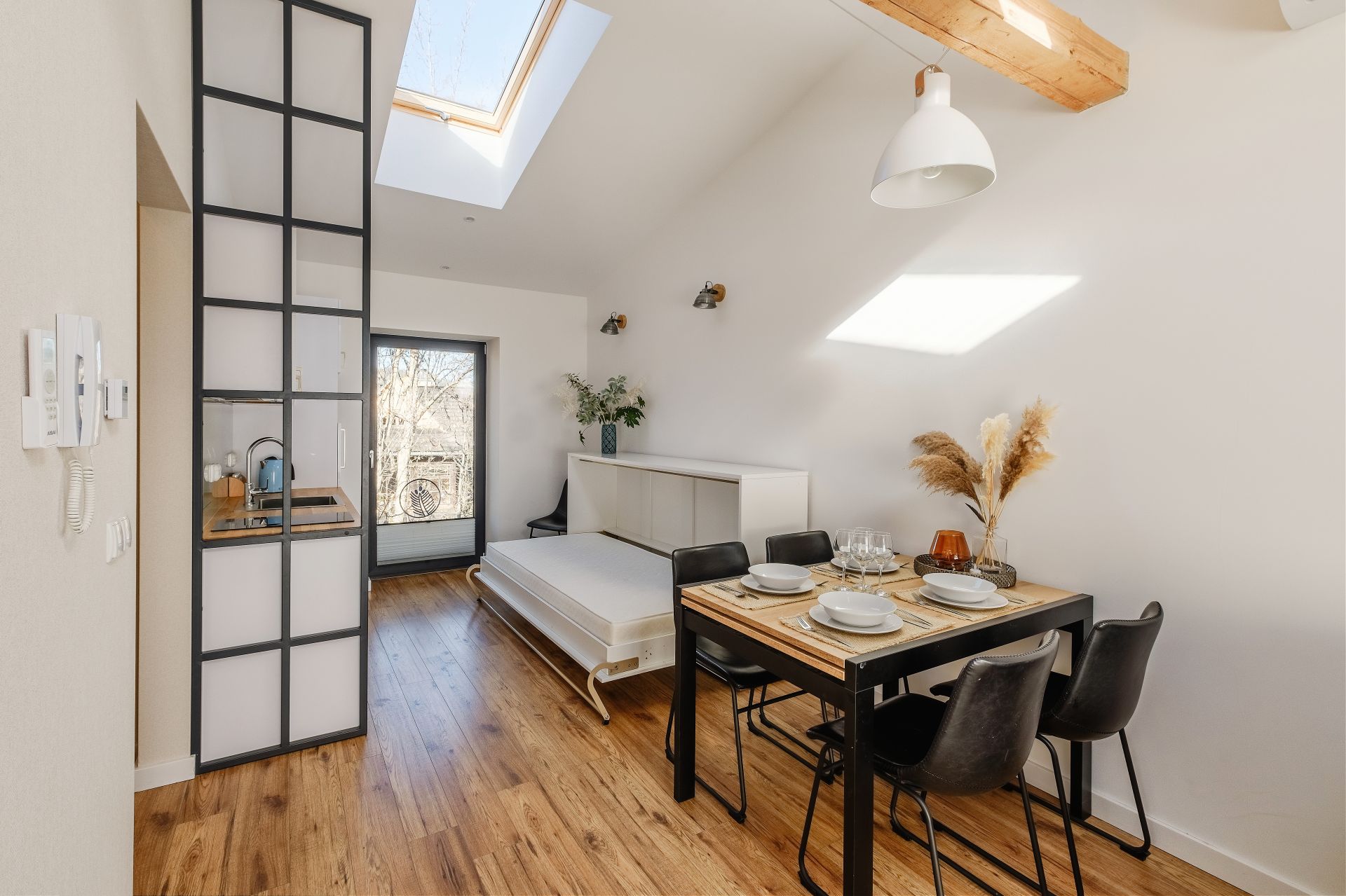 Apartament składa się z przestronnego salonu połączonego z w pełni wyposażonym aneksem kuchennym oraz łazienką z prysznicem. Z sypialni oraz z salonu jest bezpośrednie wyjście na duży taras oraz ogród.