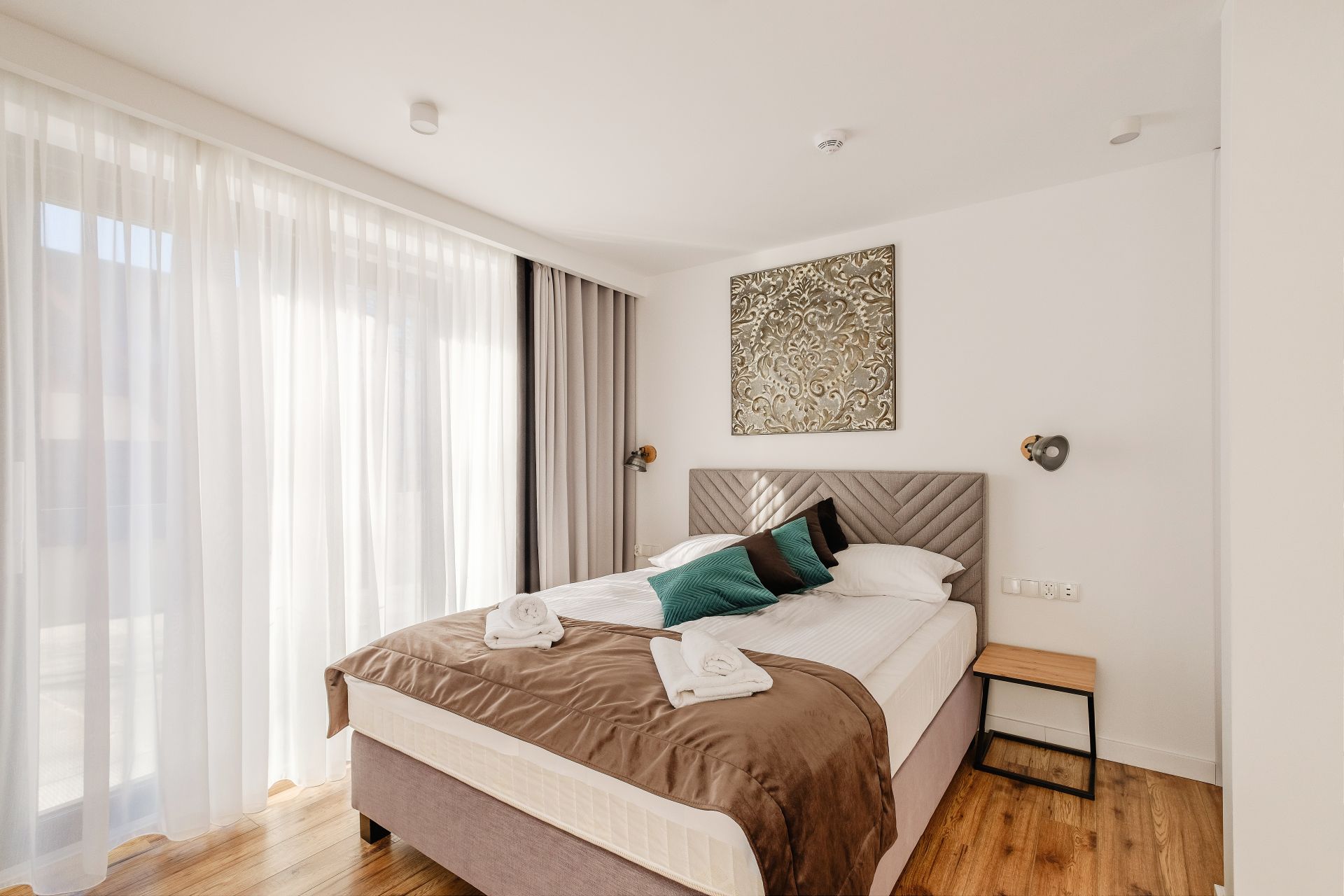 Apartament składa się z przestronnego salonu połączonego z w pełni wyposażonym aneksem kuchennym oraz łazienką z prysznicem. Z sypialni oraz z salonu jest bezpośrednie wyjście na duży taras oraz ogród.